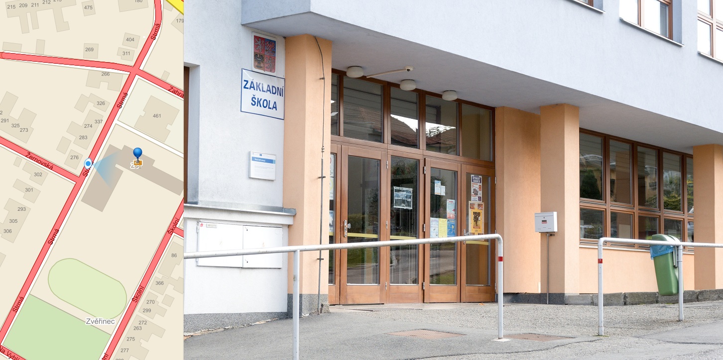 Vchod do školy je z ulice Strmé (viz obrázek):