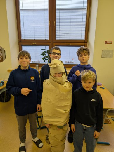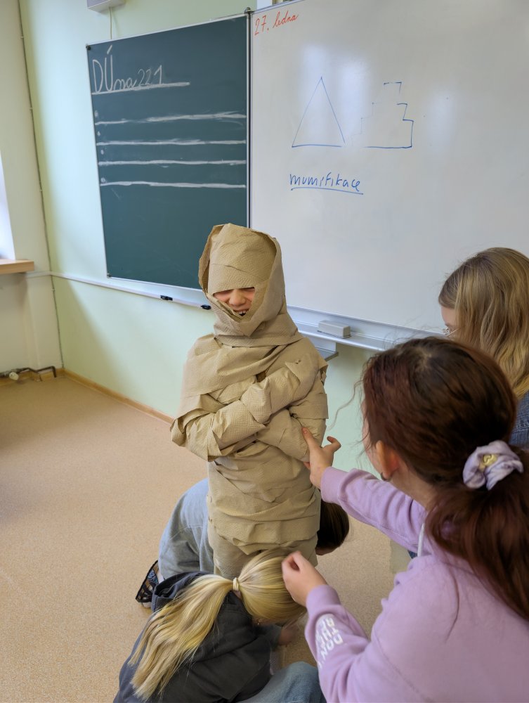 V dnešní hodině dějepisu jsme si zahráli na egyptské mumie. Někteří byli mumifikování zaživa.