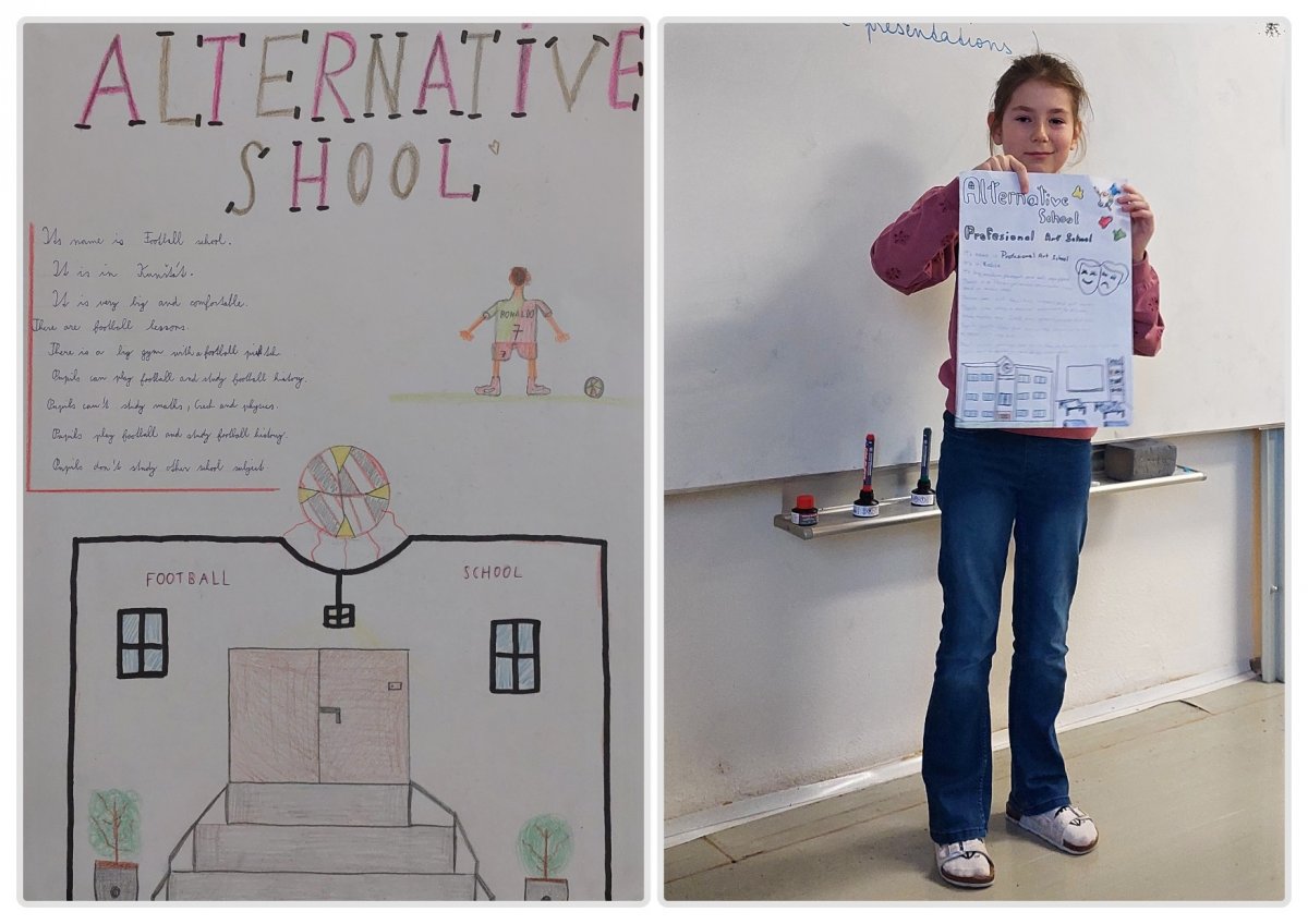 Výstupem 0. (opakovací) lekce byl náš návrh alternativní školy. Při prezentacích nám byly představeny školy originální, sportovní, fotbalové, umělecké, školy ježdění na koních, školy zaměřené na umělou inteligenci, fyziku nebo japonská manga, školy upřednostňující počítače, ale i školy s posílenou výukou češtiny jako mateřského jazyka.