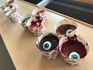 Jednou z typických halloweenských aktivit v anglicky mluvících zemích je "bobbing for apples". Žáci 7.A nejsou v této disciplíně nováčky. O tom svědčí i naprosto neuvěřitelná rychlost, s jakou někteří jablka z mísy vylovili.