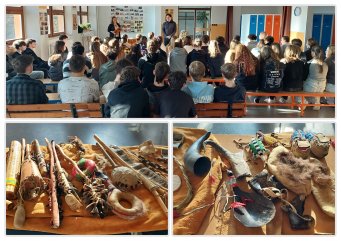 Manželé Kocůrkovi nám přinesli nejen výchovný koncert zaměřený na jednoduché hudební nástroje pastýřů a indiánů, ale také spoustu zajímavých artefaktů, které si žáci mohli osahat a vyzkoušet. Co bychom si z programu měli odnést? Že hudba má nespočet podob, spojuje, uzdravuje, zastrašuje, dodává odvahy a hlavně působí jako mezinárodní jazyk.